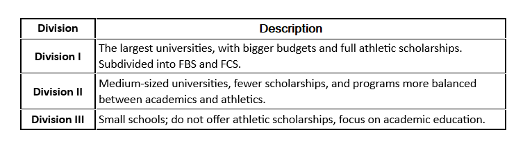 It is divided into three main divisions based on the size of the universities, their budgets, and their competitive level:
