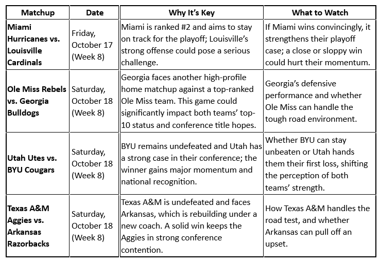 Top-ranked matchups: every game between ranked teams can dramatically shift the championship landscape.